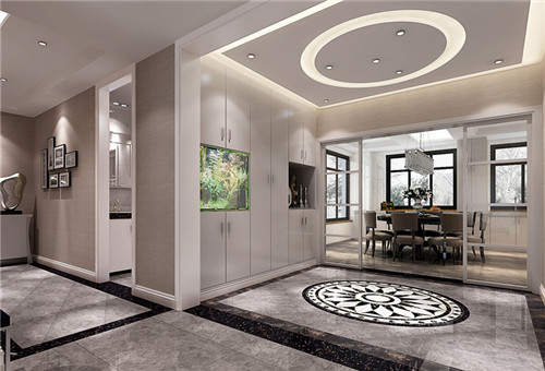 玄关处很少有空间通透的,而且由于玄关的面积小,所以平时看起来会有局促黑暗,所以要通过适当的吊顶来增加玄关的光线或者改善它的空间比例。如果玄关呈正方形,那吊顶可以做笔记方正的样式,四周吊顶中间不吊顶,这样在天花板的中心安装上吊灯以后,和地面的地砖相对应,形成很妙的视觉效果。